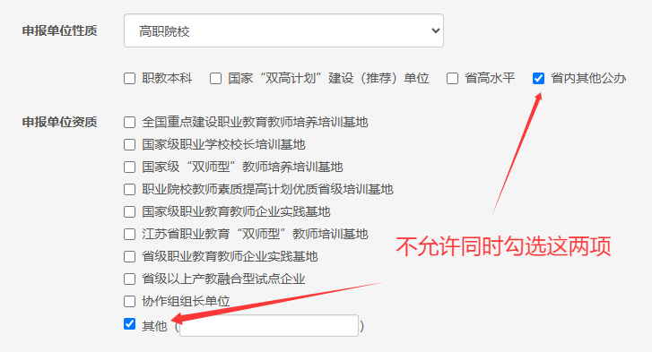 承训单位提交注册申请时,“申报单位性质”中的“高职院校-省内其他公办”和“申报单位资质”中的“其他”,不允许同时勾选。