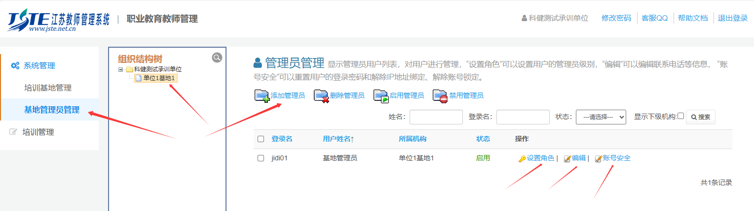 承训单位管理员在左侧菜单栏中点开“系统管理”—>“基地管理员管理”菜单,在中间“组织结构树”上点击培训基地名称,右侧页面可以添加新的管理员、修改现有的管理员角色、编辑管理员信息、管理账号安全。