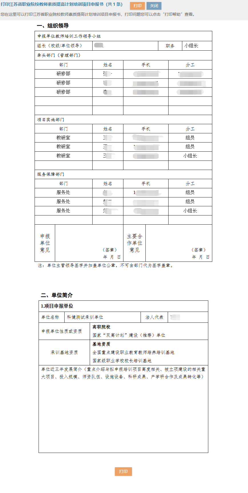 承训单位保存本单位各项信息后,点击页面最上方的“打印”按钮,可以打印预览本单位的信息。
