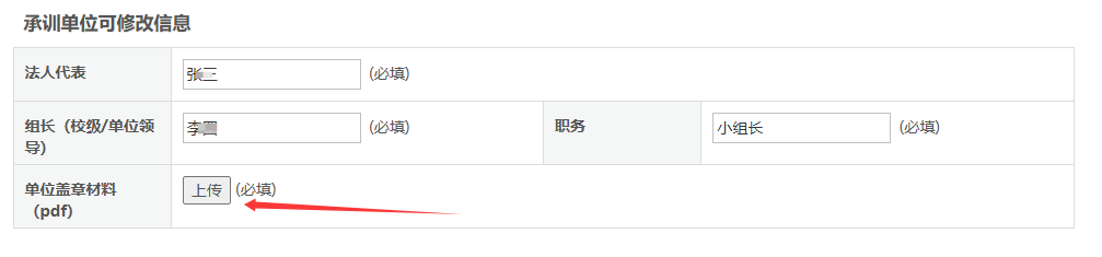 承训单位可以修改和提交本单位的信息,提交时必须上传“单位盖章材料(pdf)”pdf格式的文件材料。如下图: