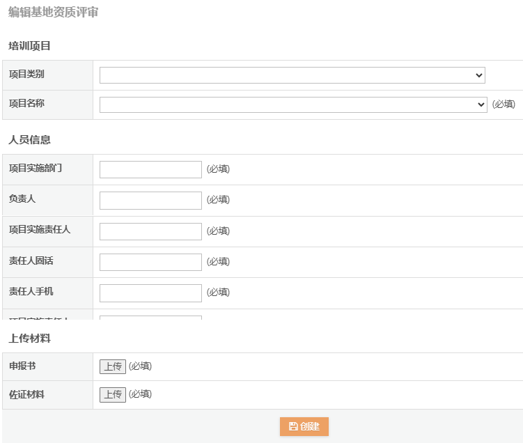 需要注意的是,在“创建”遴选材料时,基地管理员可以先填写“培训项目”及“培训人员”相关内容并保存创建,不必同时上传“申报书”及“佐证材料”附件。附件内容仅在最终执行“提交”操作时要求上传。