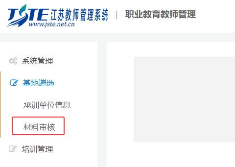 承训单位管理员在左侧菜单栏中点开“基地遴选”“材料审核”菜单,可打开遴选材料列表界面