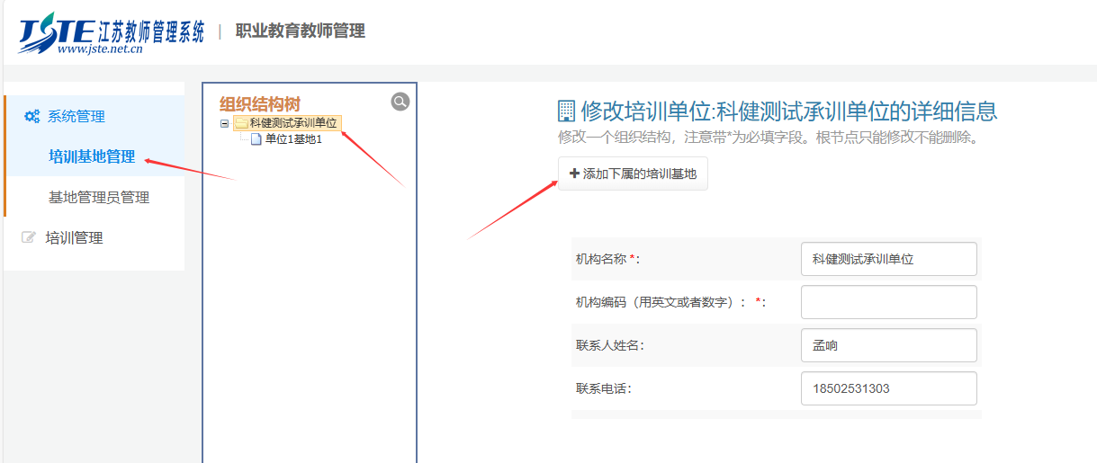 承训单位管理员在左侧菜单栏中点开“系统管理”—>“培训基地管理”菜单,在中间“组织结构树”上点击本单位名称,右侧页面点击“添加下属的培训基地”按钮。可以添加新的培训基地机构信息。