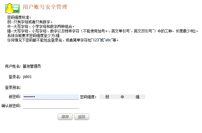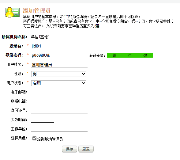 在添加管理员页面,填写各项信息,点击“保存”按钮,即可添加一个新的基地管理员账号。如下图: